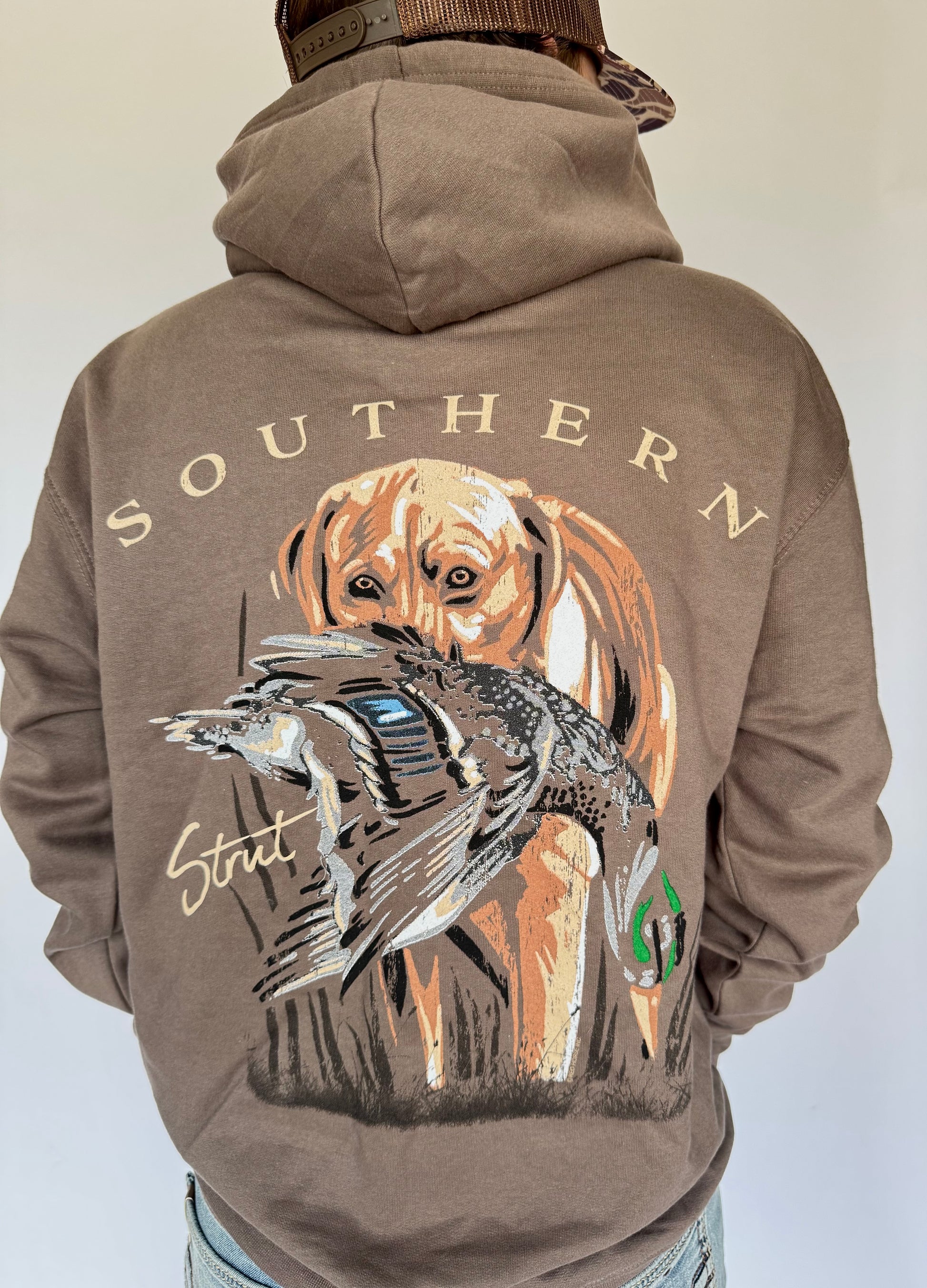 This mocha brown hoodie features a hand-sketched lab and duck, making this hoodie a timeless piece for every outdoorsman.
